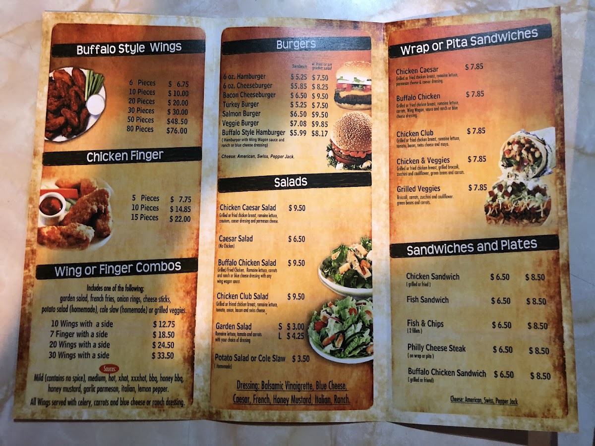 Choice of Wrap or Pita. Chicken can be Grilled or Fried. Includes: Romaine lettuce, Carrots, Wing Wagon Sauce and choice of ranch or blue cheese.